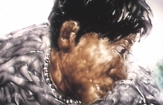 An apple flows down a stream, where innumerable illusions of fish appear in the sky, reflected by the water.